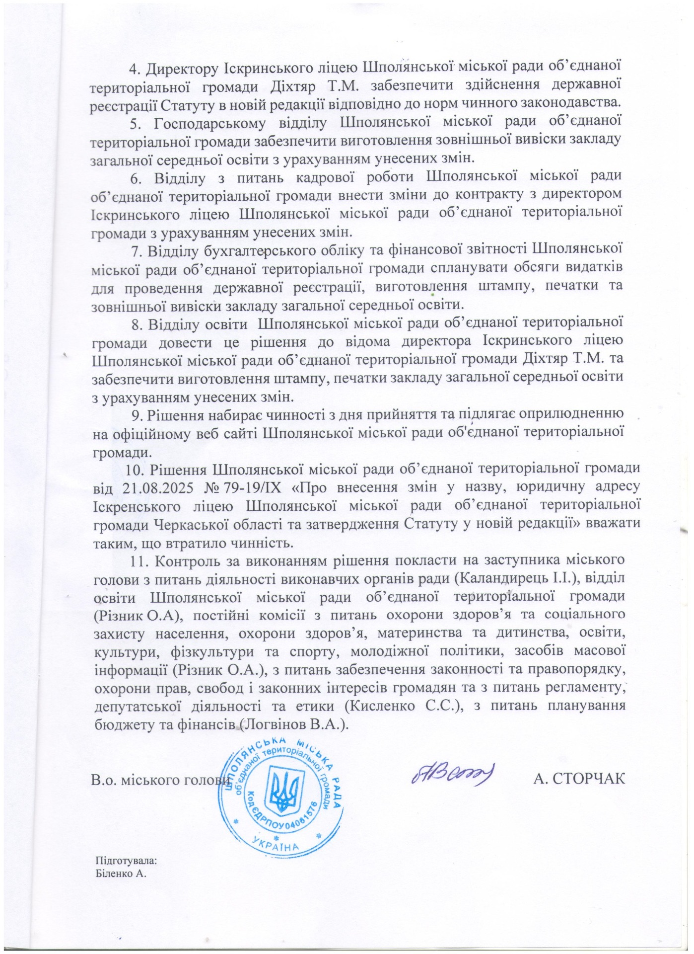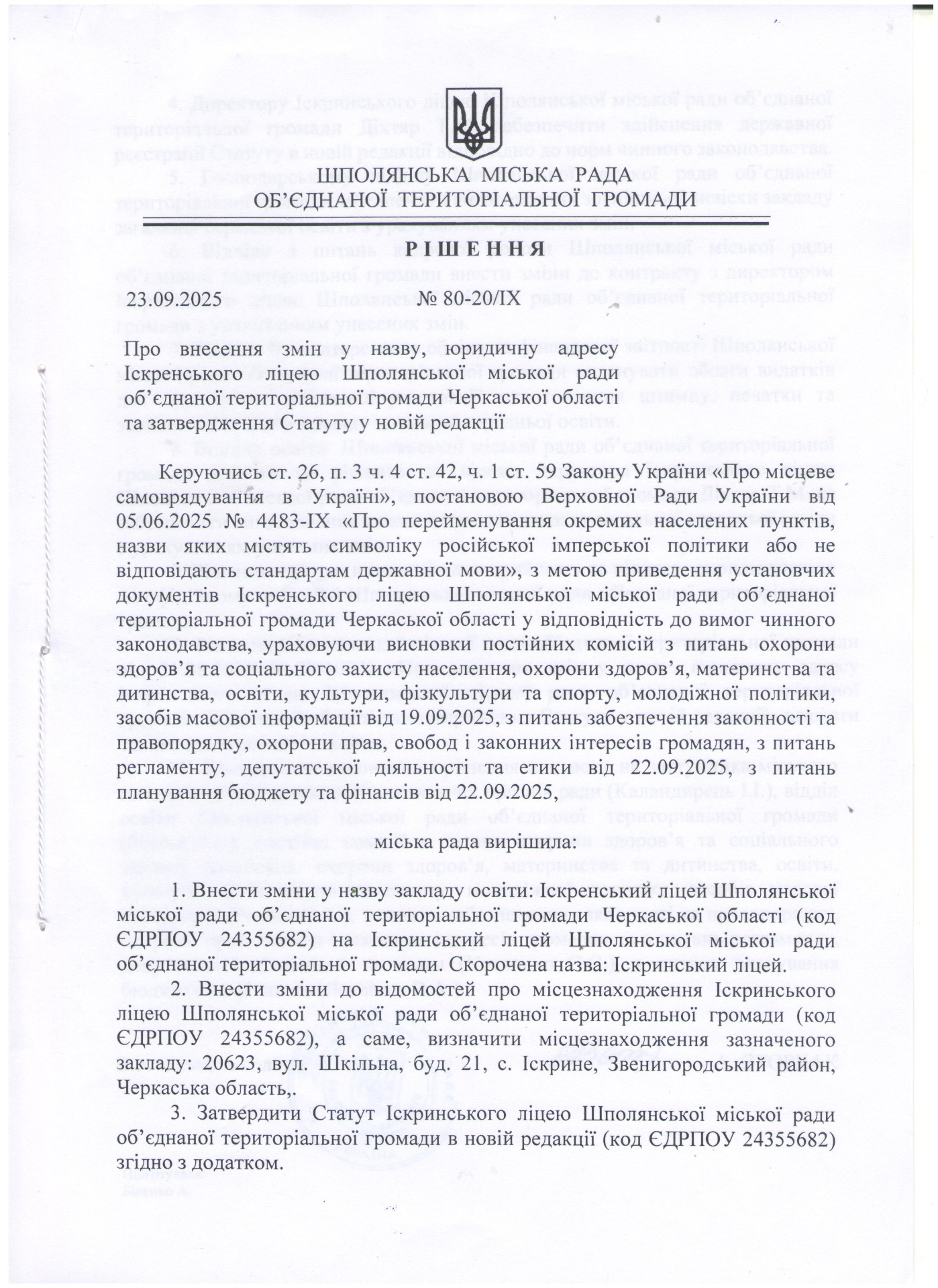 1.4. Іскренський ліцей Шполянської міської ради об'єднаної територіальної громади Черкаської області (далі - ліцей) у своїй діяльності керуєтьсяКонституцією України, Законами України «Про освіту», «Про повну загальну середню освіту», «Про дошкільну освіту» постановами Верховної Ради України, Кабінету Міністрів України, актами Президента України, центральним органом виконавчої влади у сфері освіти і науки, інших центральних органів виконавчої влади, рішеннями Шполянської міської ради об'єднаної територіальної громади та її виконавчого комітету, розпорядженнями міського голови, іншими рішеннями органу місцевого самоврядування, положеннями про дошкільний навчальний заклад, іншими нормативно-правовими актами та цим статутом.